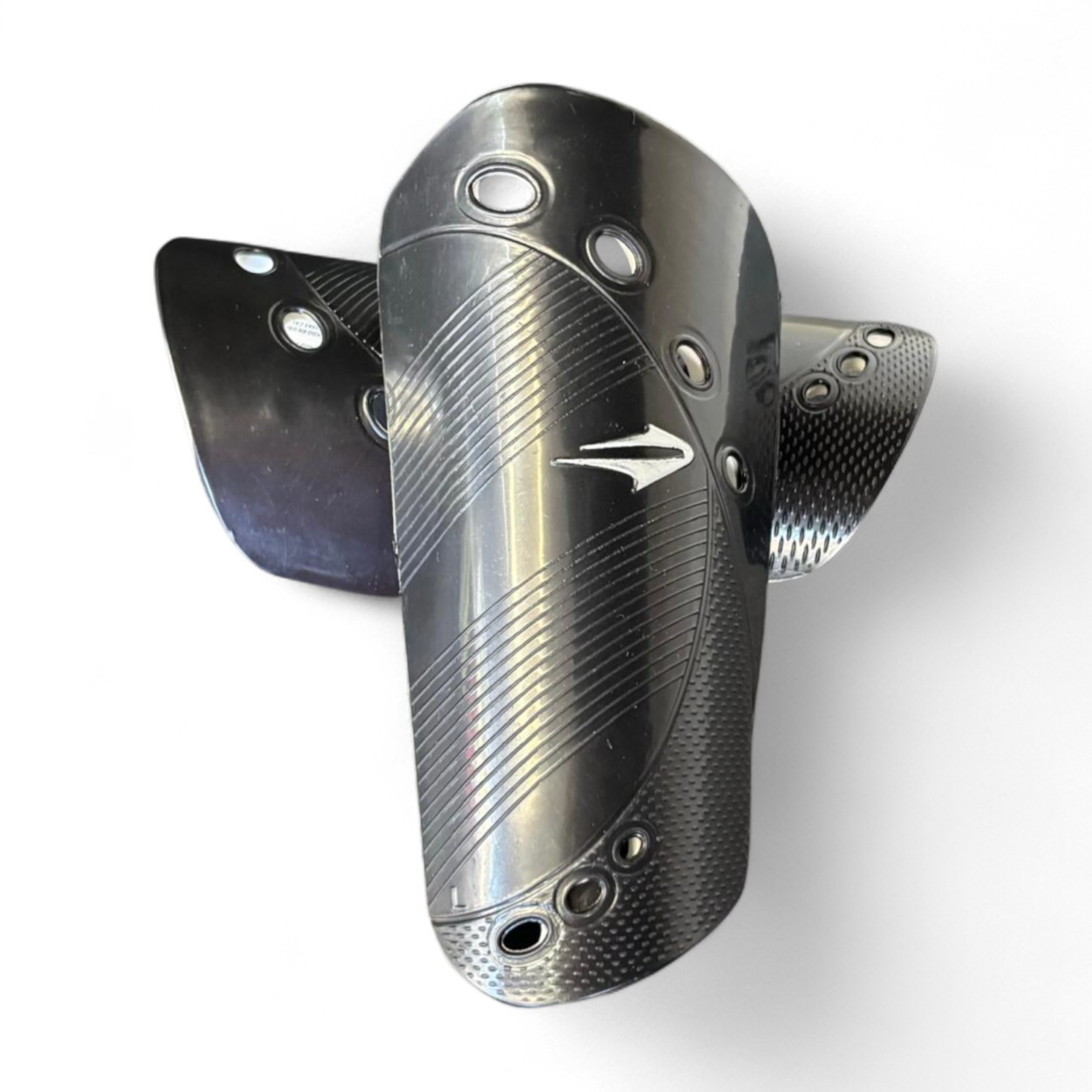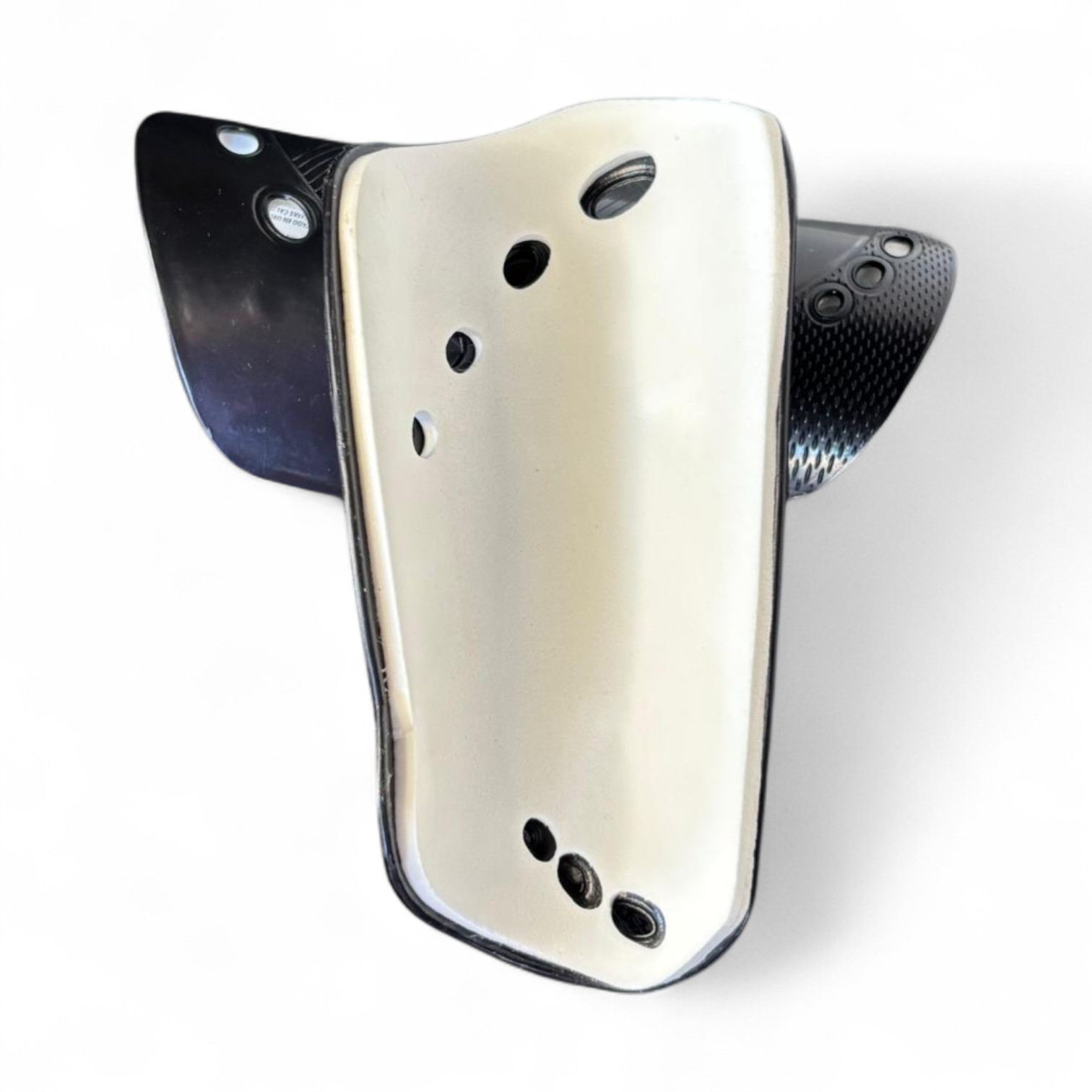 Canilleras Topper con una parte anterior de plastico para amortiguar golpes acompañado de orifios para venitlar y una parte posterior con goma eva para darle comododidad al usuario.