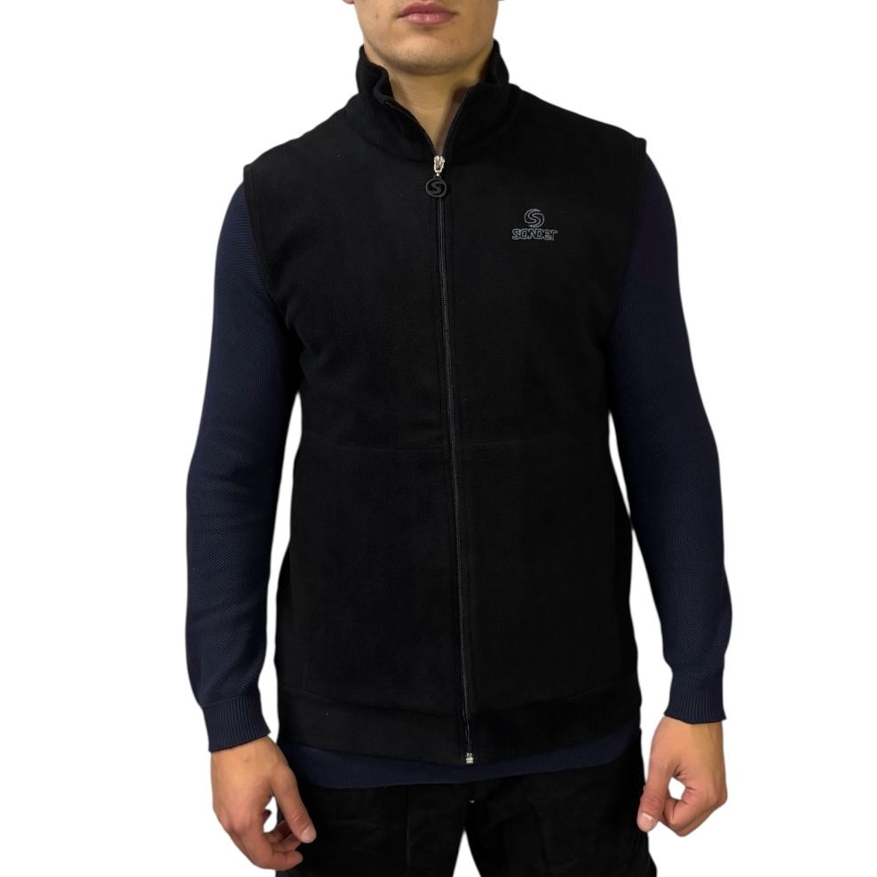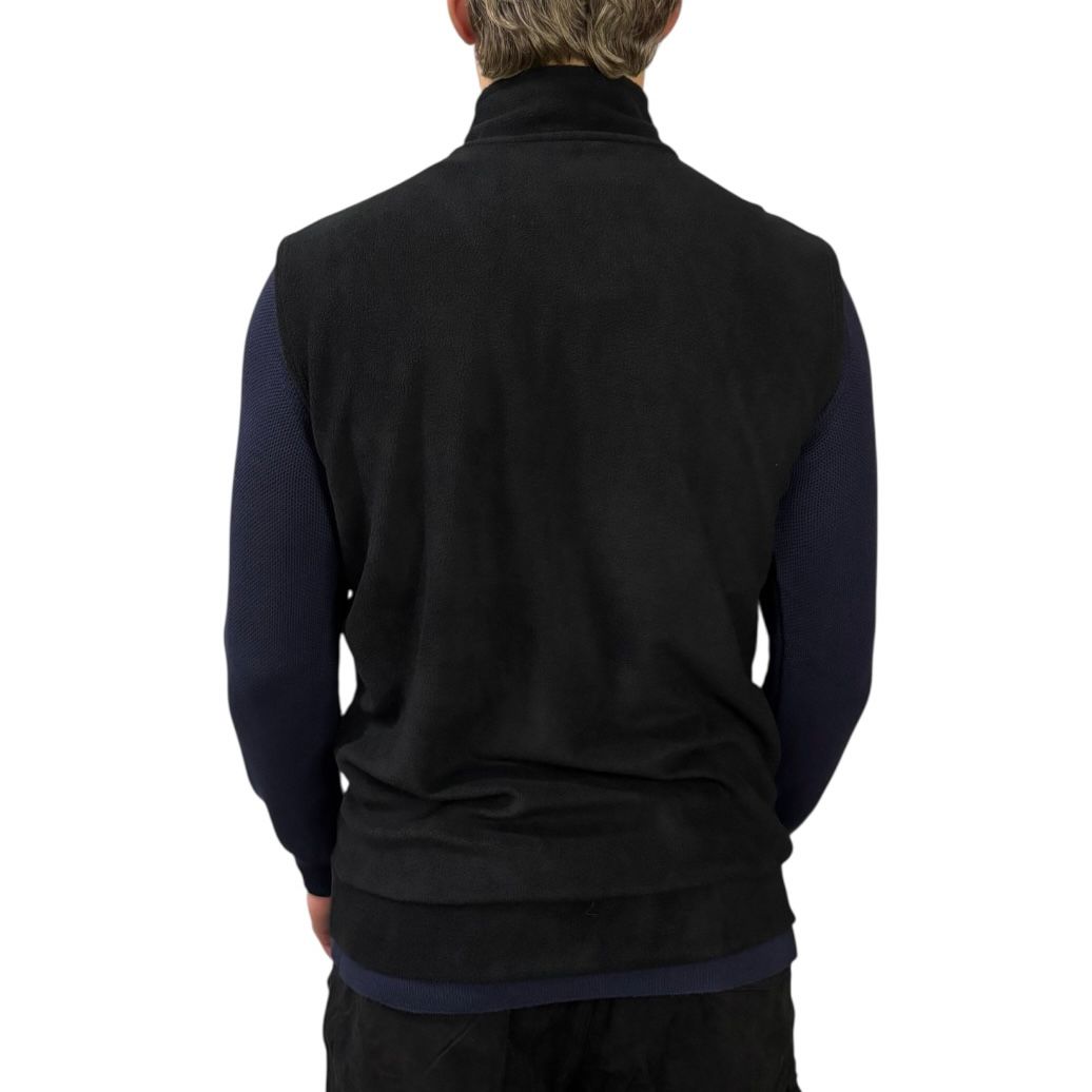 Chaleco unisex de microplar negro, con bolsillos y estampa, 100% poliester.
